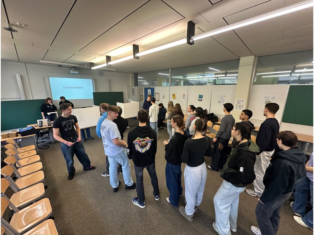 Zu Beginn fand ein 45‑minütiger Vortrag statt, in dem die Schülerinnen und Schüler über die Bedeutung von Wahlen in einer Demokratie informiert wurden. Dabei wurde insbesondere auf die Notwendigkeit demokratischer Beteiligung sowie auf die Rolle und Wichtigkeit der Kommunalpolitik eingegangen. Den Jugendlichen wurde verdeutlicht, dass politische Entscheidungen vor Ort ihren direkten Lebensraum betreffen und somit jede und jeden Einzelnen betreffen.