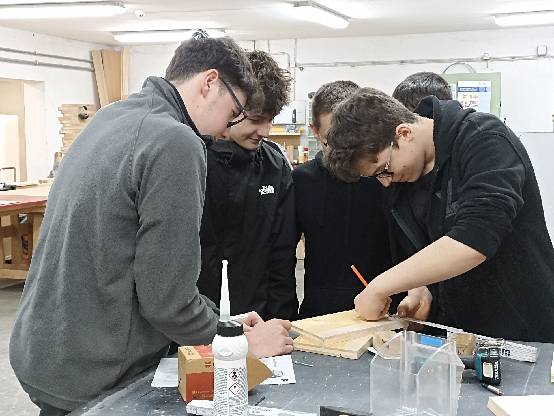 Der spannendste Teil folgte im Anschluss: Die Schülerinnen und Schüler durften selbst Hand anlegen. In kleinen Gruppen bauten sie unter fachkundiger Anleitung der Mitarbeiter an ihrem Projekt. Zunächst wurden die einzelnen Holzteile abgemessen, angezeichnet, geschliffen und schließlich verschraubt. Teamarbeit war dabei besonders wichtig, denn nur gemeinsam gelang es, die einzelnen Arbeitsschritte sorgfältig umzusetzen.