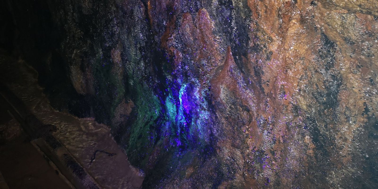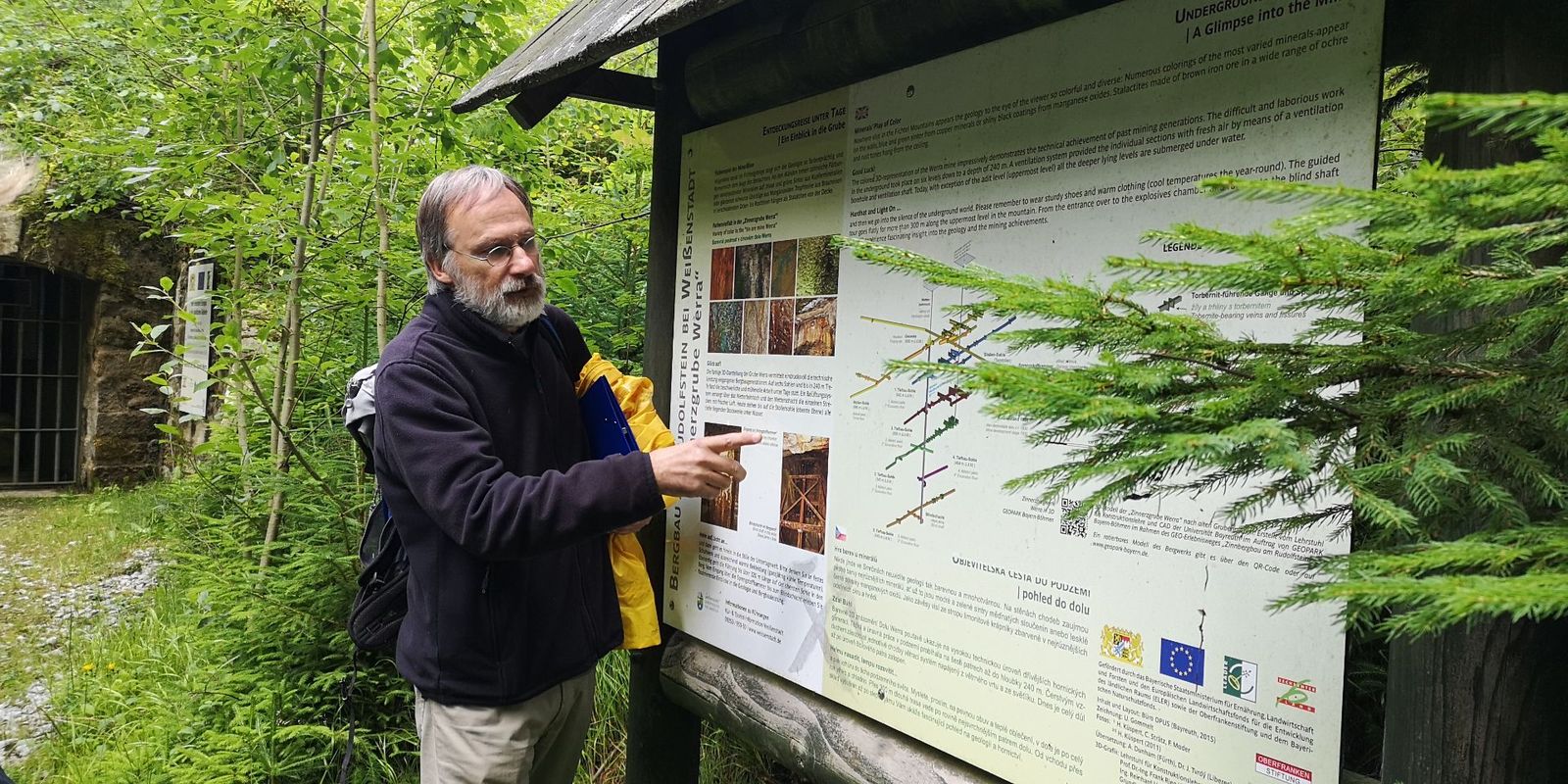 Nach einer (sehr) kurzen Nacht mussten wir früh wieder auf unsere Räder um zur nächsten Station – einem echten Highlight – zu gelangen. Die Zinngrube Werra unterhalb des Schneeberges wurde in der Nachkriegszeit zu einem Geheimprojekt der noch jungen Bundesrepublik. Hier wurde nach Uran gesucht und man wurde fündig! Einen sehr tiefen Einblick in dieses Bergwerk vermittelte uns der Leiter des Geoparks Bayern-Böhmen Herr Dr. Peterek. Der unheimlichen Atmosphäre dieses Bergwerkes konnte sich niemand entziehen. Eine UV-Lampe, die die Wände und Decken des Stollens in bunten Farben zum Leuchten brachte, verstärkte diesen Eindruck noch. Am Ende war doch jeder wieder froh im Freien und im Tageslicht zu stehen.