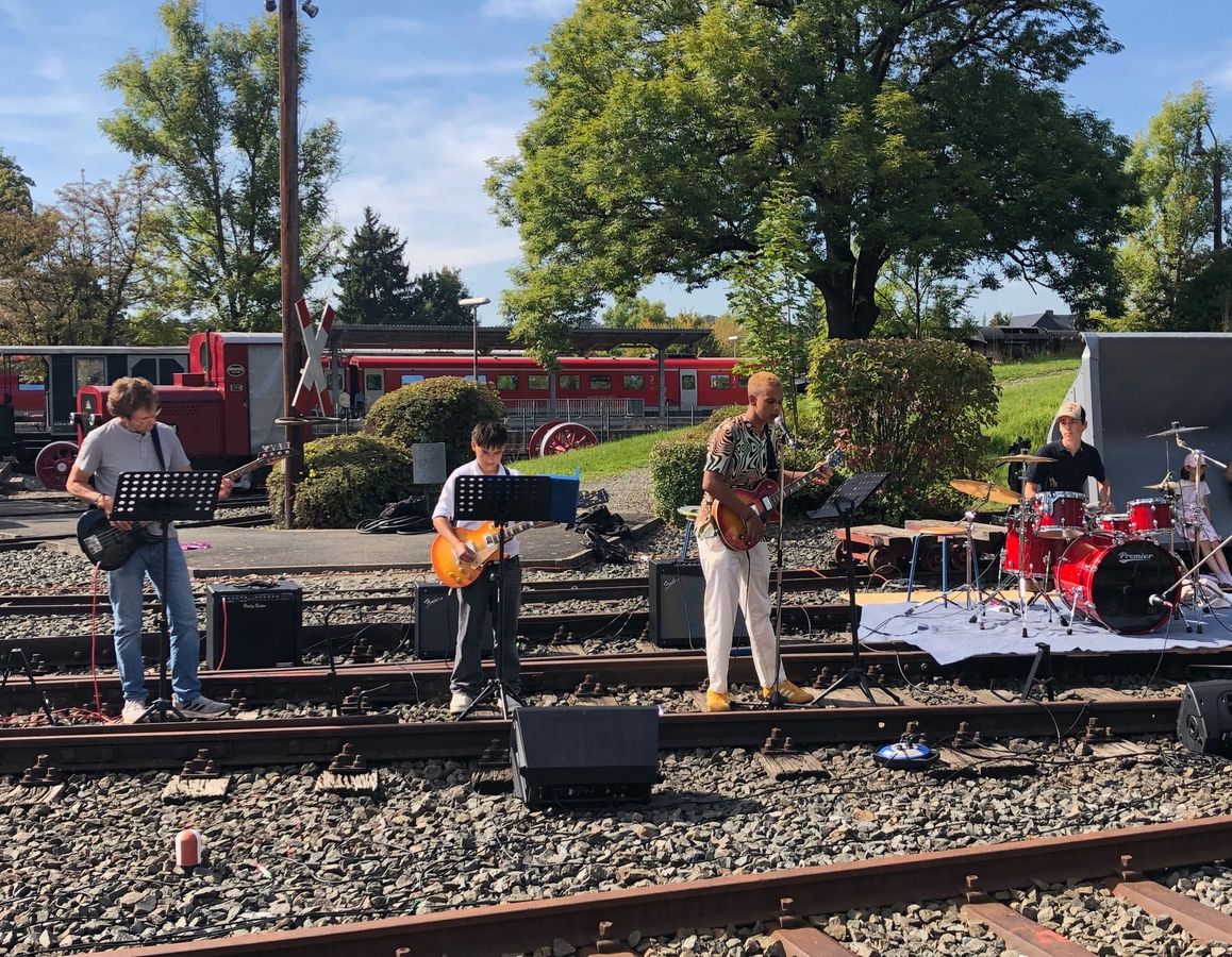Bei strahlendem Spätsommerwetter war die Carl-von-Linde-Schulband anlässlich des 50. Jubiläums der Interkulturellen Woche im Deutschen Dampflokomotiv-Museum in Neuenmarkt zu Gast. Zwischen historischen Lokomotiven und auf echten Gleisen wurde die Bühne zu einem ganz besonderen Konzertort – und unsere Musiker sorgten dort für beste Stimmung.
