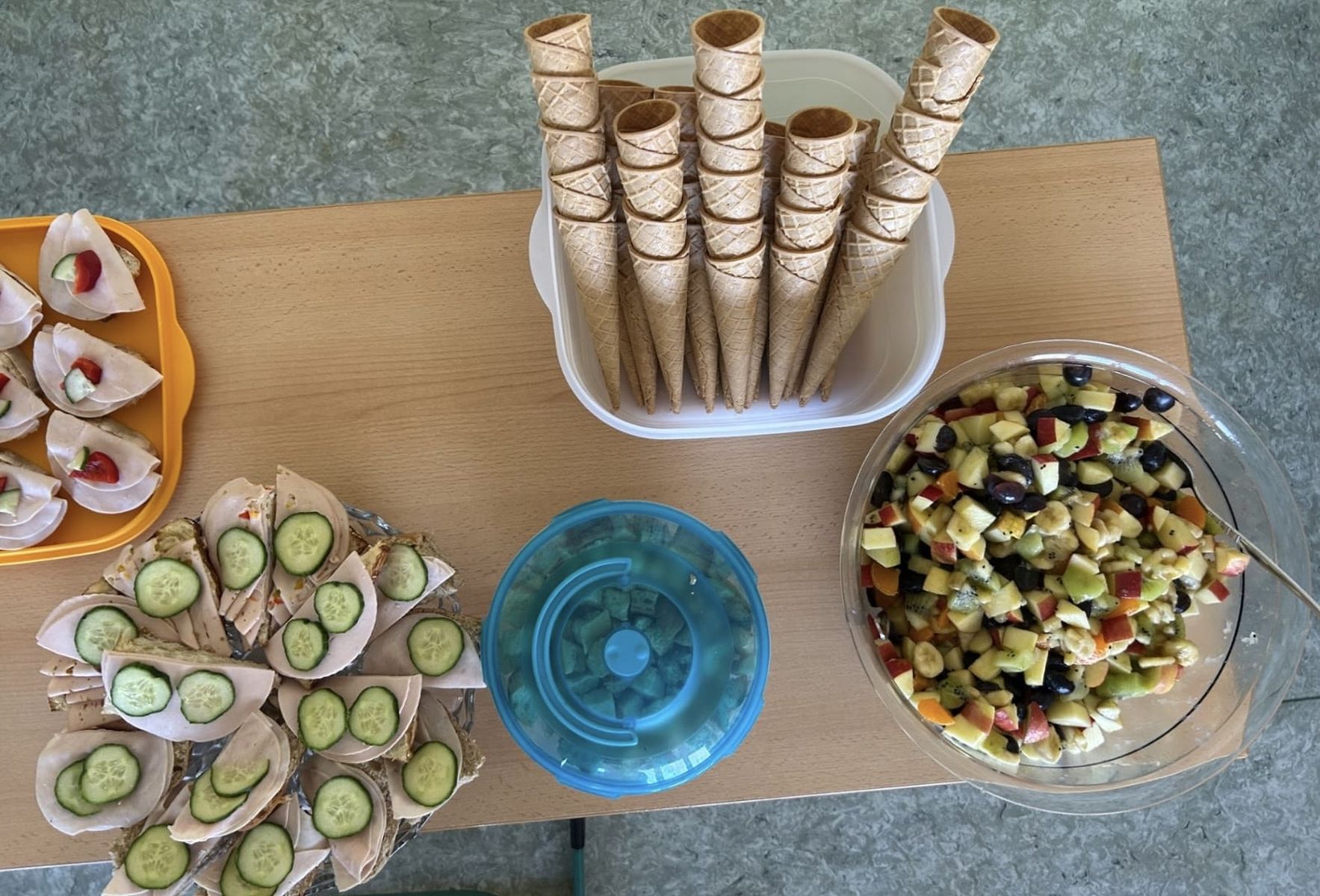 Unsere Realschule präsentierte das Nachhaltigkeitsziel Nr. 2: „Den Hunger beenden, Ernährungssicherheit erreichen und nachhaltige Landwirtschaft fördern“. Vorgestellt wurden unsere neu gestartete Kooperation mit FoodSharing Kulmbach sowie das Konzept der „Gesunden Pause – gute und gesunde Schule“. Mit geretteten Lebensmitteln stellten wir ein buntes und äußerst leckeres Buffet zusammen.