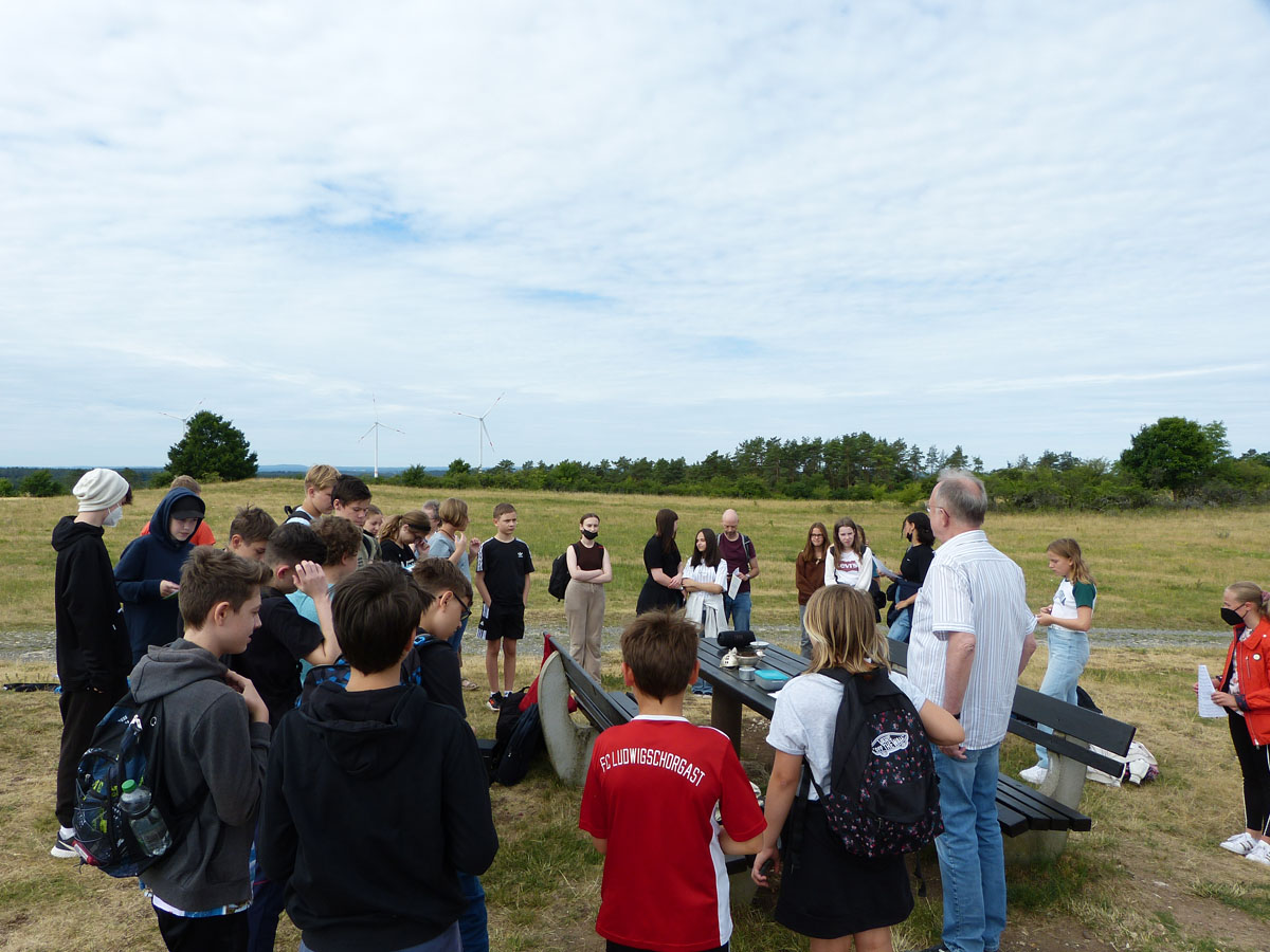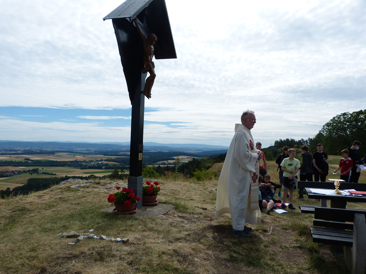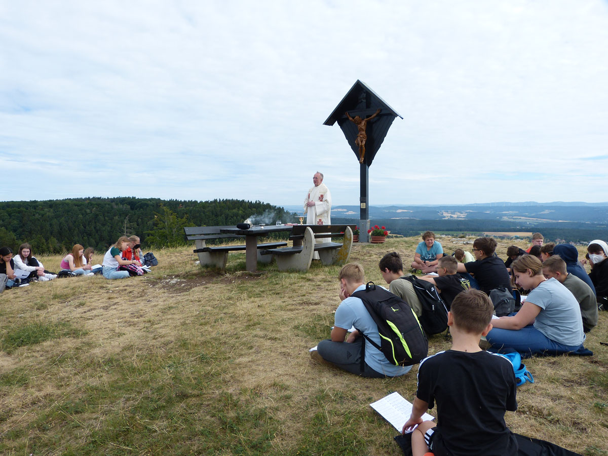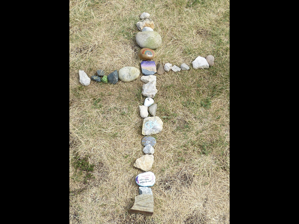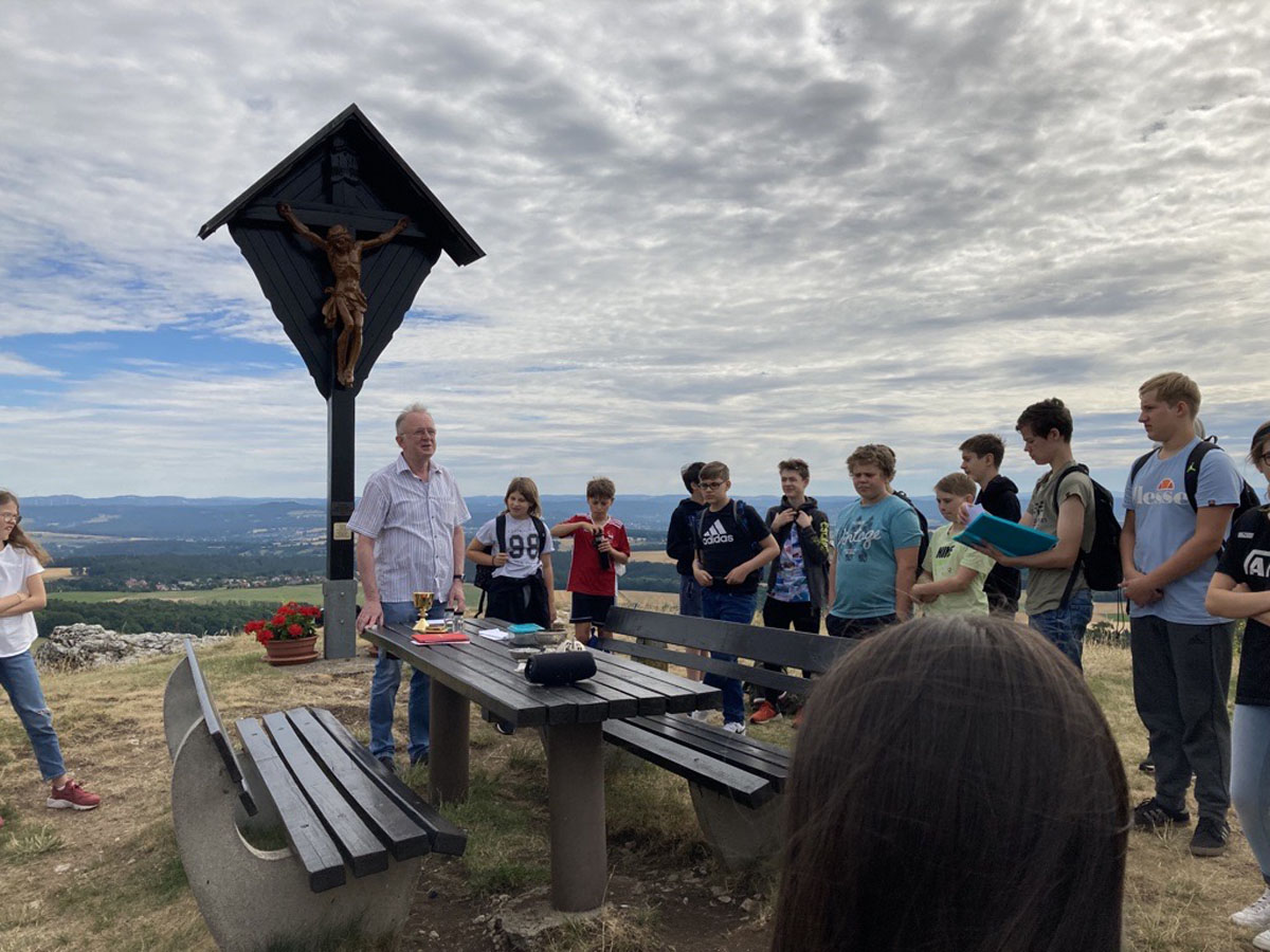 Das Kreuz am Görauer Anger war das Ziel einer Exkursion der katholischen Schüler/Innen der 6. und 7. Klassen. Der Weg führte uns vorbei an der Gedenkstätte für die Kinder, die hier Opfer von Granaten des Zweiten Weltkriegs geworden waren. Wir beteten für Kinder in Krieg und Not und legten für sie ein steinernes Herz. Am „Gipfel“ feierten wir dann zusammen mit Pfarrer Roppelt einen Gottesdienst - in der Natur, mit freiem Blick in die Weite und in den Himmel. Hier hinterließen wir ein steinernes Kreuz.