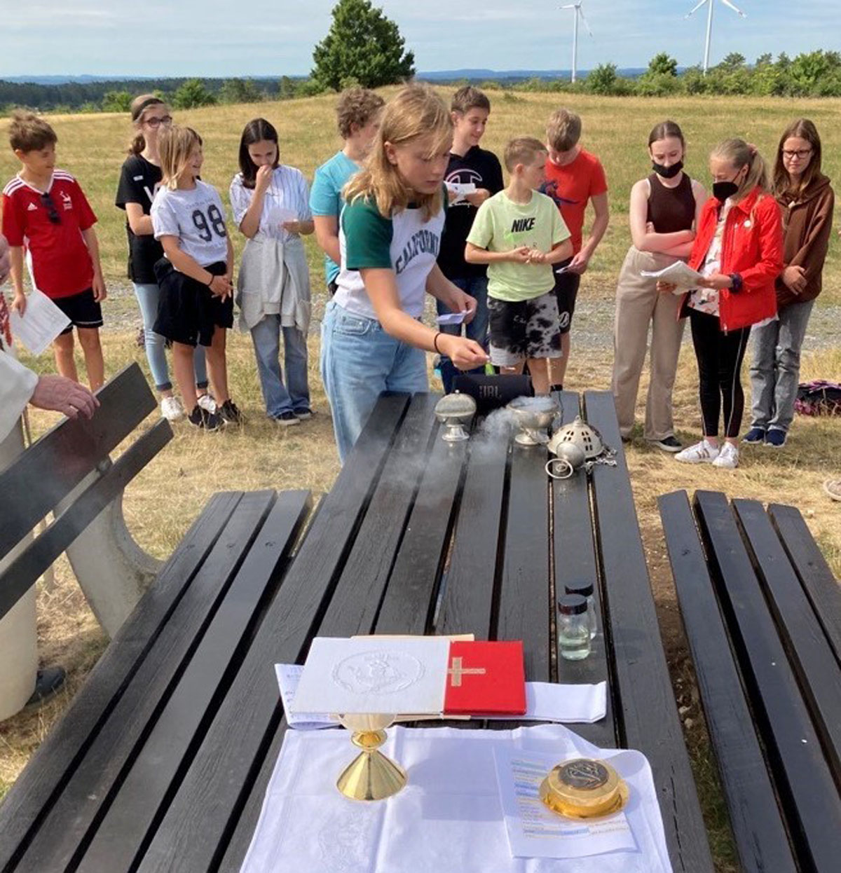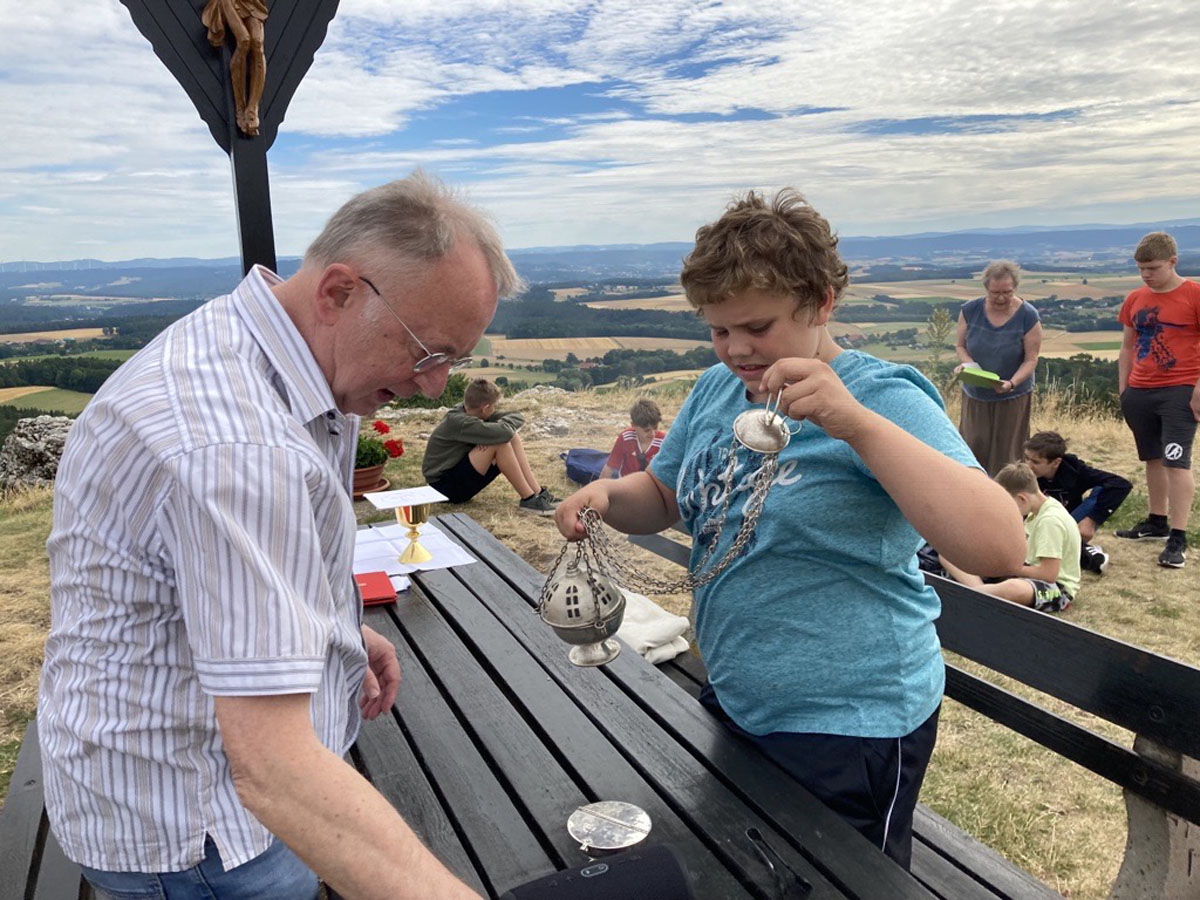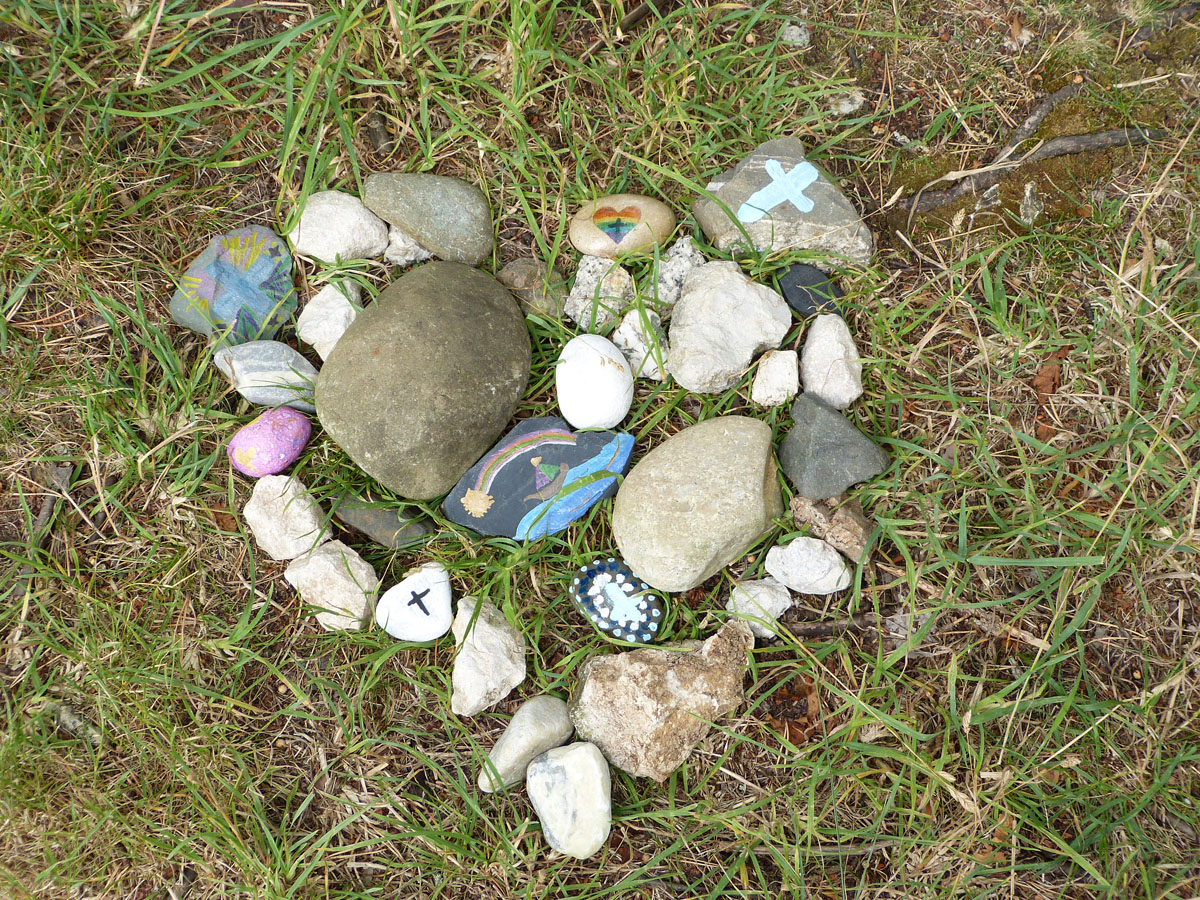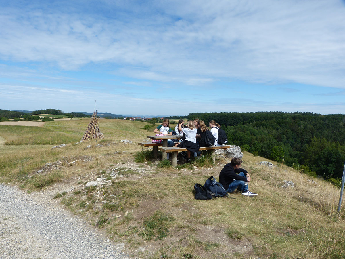 Das Kreuz am Görauer Anger war das Ziel einer Exkursion der katholischen Schüler/Innen der 6. und 7. Klassen. Der Weg führte uns vorbei an der Gedenkstätte für die Kinder, die hier Opfer von Granaten des Zweiten Weltkriegs geworden waren. Wir beteten für Kinder in Krieg und Not und legten für sie ein steinernes Herz. Am „Gipfel“ feierten wir dann zusammen mit Pfarrer Roppelt einen Gottesdienst - in der Natur, mit freiem Blick in die Weite und in den Himmel. Hier hinterließen wir ein steinernes Kreuz.