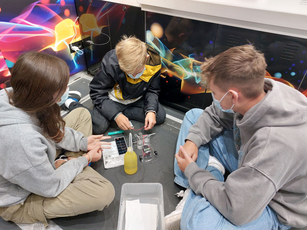 Besonders eindrucksvoll für die Schüler:innen war der 90minutige Workshop zur Elektromobilität, bei dem die Schüler:innen in Gruppen ein Brennstoffzellenauto bauten. Das Siegerauto wurde bei einem Rennen gegeneinander gekürt.