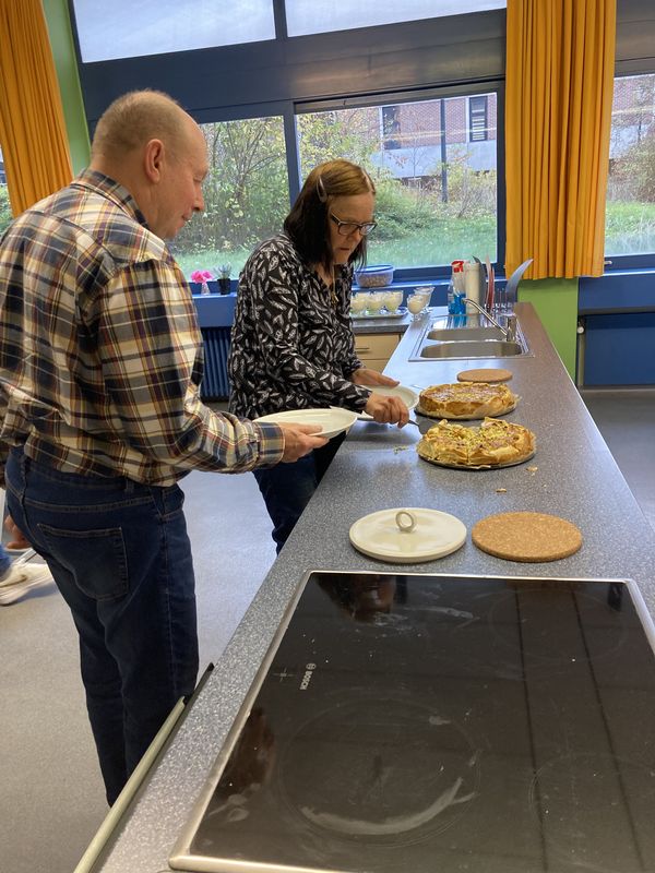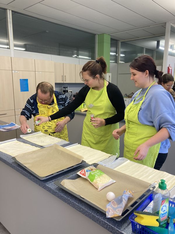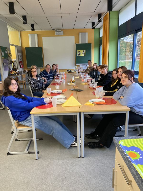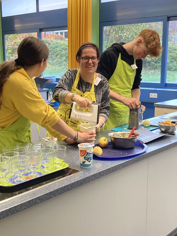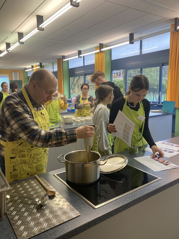 Das Schulmotto der Carl-von-Linde Realschule „miteinander leben – voneinander lernen“ bekommt durch ein Kooperationsprojekt der Realschule mit dem Haus Schmeilsdorf einen ganz neuen Geschmack. Acht Schülerinnen und Schüler des Sozialwesenzweiges und vier Bewohner des Hauses Schmeilsdorf absolvierten einen Kochkurs unter Leitung der Lehrkraft für Ernährung und Gesundheit, Katharina Rödel, in der Schulküche der Realschule. Die Vorfreude war auf beiden Seiten groß. „Wir freuen uns sehr, dass ihr unsere Gäste seid“, begrüßte Schulleiterin Monika Hild die Menschen mit Beeinträchtigung des Hauses Schmeilsdorf, die sich zusammen mit ihrer Betreuerin, Melanie Dittrich, und ausgestattet mit Schürzen in der Schulküche eingefunden hatten. Das Ziel der Kooperation - initiiert durch Kerstin Fuchs, Case Managerin im Haus Schmeilsdorf - ist, durch einen offenen Umgang mit dem Thema Beeinträchtigung und über gemeinsames Kochen, Berührungsängste abzubauen sowie Toleranz und Verständnis für Betroffene zu fördern. In vier Kochteams, zusammengesetzt aus je zwei Schülerinnen und Schülern und einem Gast aus Schmeilsdorf wurde ein leckeres herbstliches Drei-Gänge-Menü gezaubert. Es war wunderbar zu sehen, welche Freude es machte, gemeinsam zu schneiden, Suppe abzuschmecken, Sahne zu schlagen, Äpfel zu reiben, Käsestangen zu drehen und Cocktails zu mixen. So kamen die Teilnehmenden schnell ins Gespräch, gaben sich Hilfestellungen und tauschten sich über Kocherfahrungen aus. Beim anschließenden Essen zeigte sich, dass durch das gemeinsame Kochen bereits sämtliche Berührungsängste abgebaut waren. In fröhlicher Runde wurde über die Freude am Kochen, Urlaubspläne und Freizeitbeschäftigungen geplaudert. Die teilnehmenden Schülerinnen und Schüler erfuhren so Spannendes über den Alltag in den Wohngruppen des Hauses Schmeilsdorf. Auch überragende Fremdsprachenkenntnisse einer Bewohnerin des Hauses Schmeilsdorf traten zu Tage. So wurde das Motto „voneinander lernen“ gelebt. Am Ende des Projektauftaktes verabschiedeten sich alle Beteiligten glücklich und satt nach Hause, mit jeder Menge neuer Erfahrungen im Bereich Koch- und Sozialkompetenz und nicht zuletzt mit dem Wissen, was man unter einer „Chaiselounge“ versteht, auf der man sich getrost nach dem langen, erfolgreichen Tag ausruhen kann. Es war ein überaus bereichernder, kurzweiliger und von gegenseitiger Sympathie geprägter Kochnachmittag, nach dem sich alle Beteiligten einig waren: Eine Fortsetzung der Kooperation und Wiederholung dieses Kochprojekts wird bald folgen.