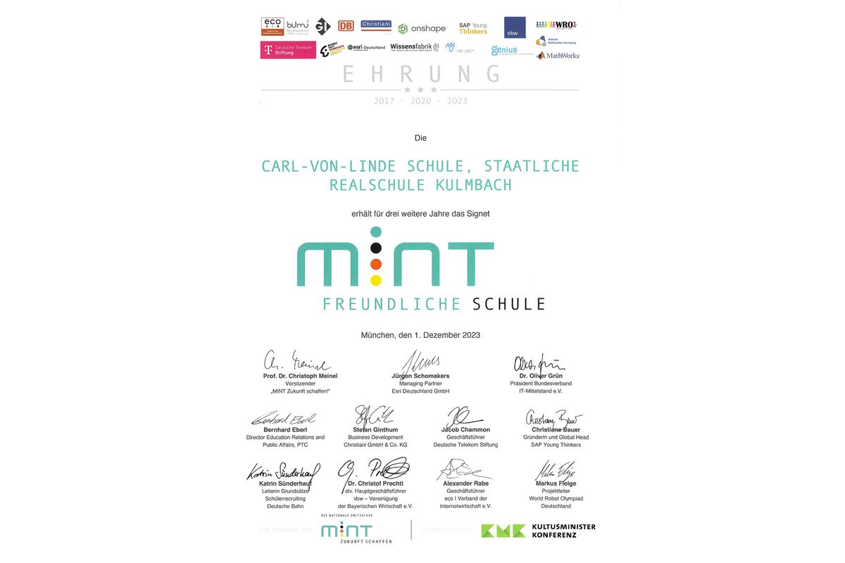 122 Schulen aus Bayern wurden vom bayerischen Staatsminister für Digitales Dr. Fabian Mehring, MdL, Dr. Wieland Holfelder von Google, Dr. Christof Prechtl von vbw und Harald Fisch, Vorstand “MINT Zukunft schaffen!” als „MINT-freundliche Schule“ und/oder “Digitale Schule” ausgezeichnet. Die Auszeichnungen sind drei Jahre gültig.
